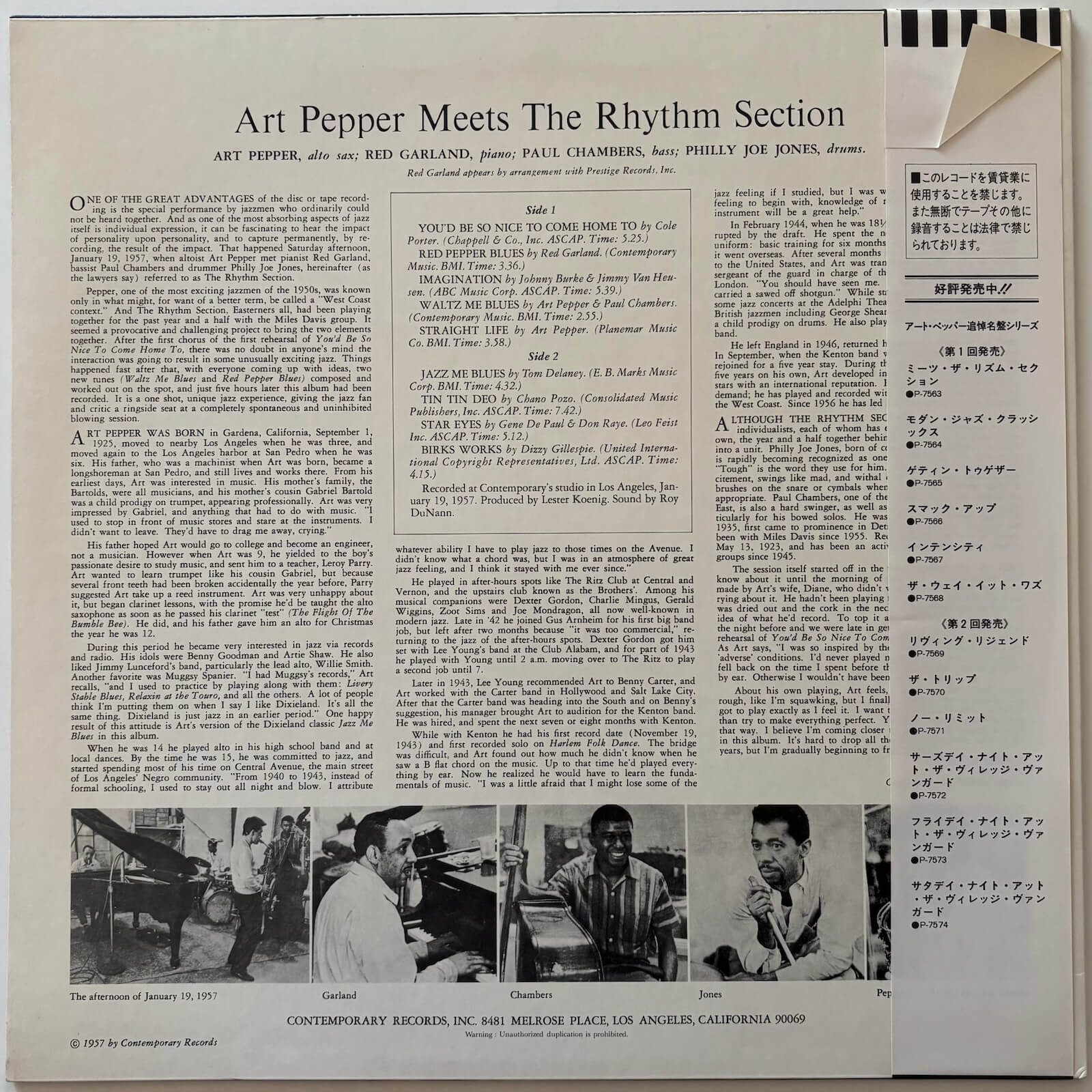 The rhythm section written into the title is the best in jazz at that particular moment — Garland's comping is authoritative and loose simultaneously, Chambers plays with extraordinary intonation and tone, Jones's ride cymbal work is among the most studied in the hard bop era. Pepper, for his part, plays above whatever difficulties surrounded the session. Two compositions were written in the room: "Red Pepper Blues" by Garland, "Waltz Me Blues" by Pepper and Chambers. Pepper's own "Straight Life" — the title he would later give his autobiography — is the album's most driven piece. "Tin Tin Deo," by Chano Pozo and Dizzy Gillespie, runs over seven minutes. "Birks Works" closes Side B hard. Between the five standards and the three originals sits "Imagination," a Johnny Burke and Jimmy Van Heusen ballad Pepper takes slowly.
