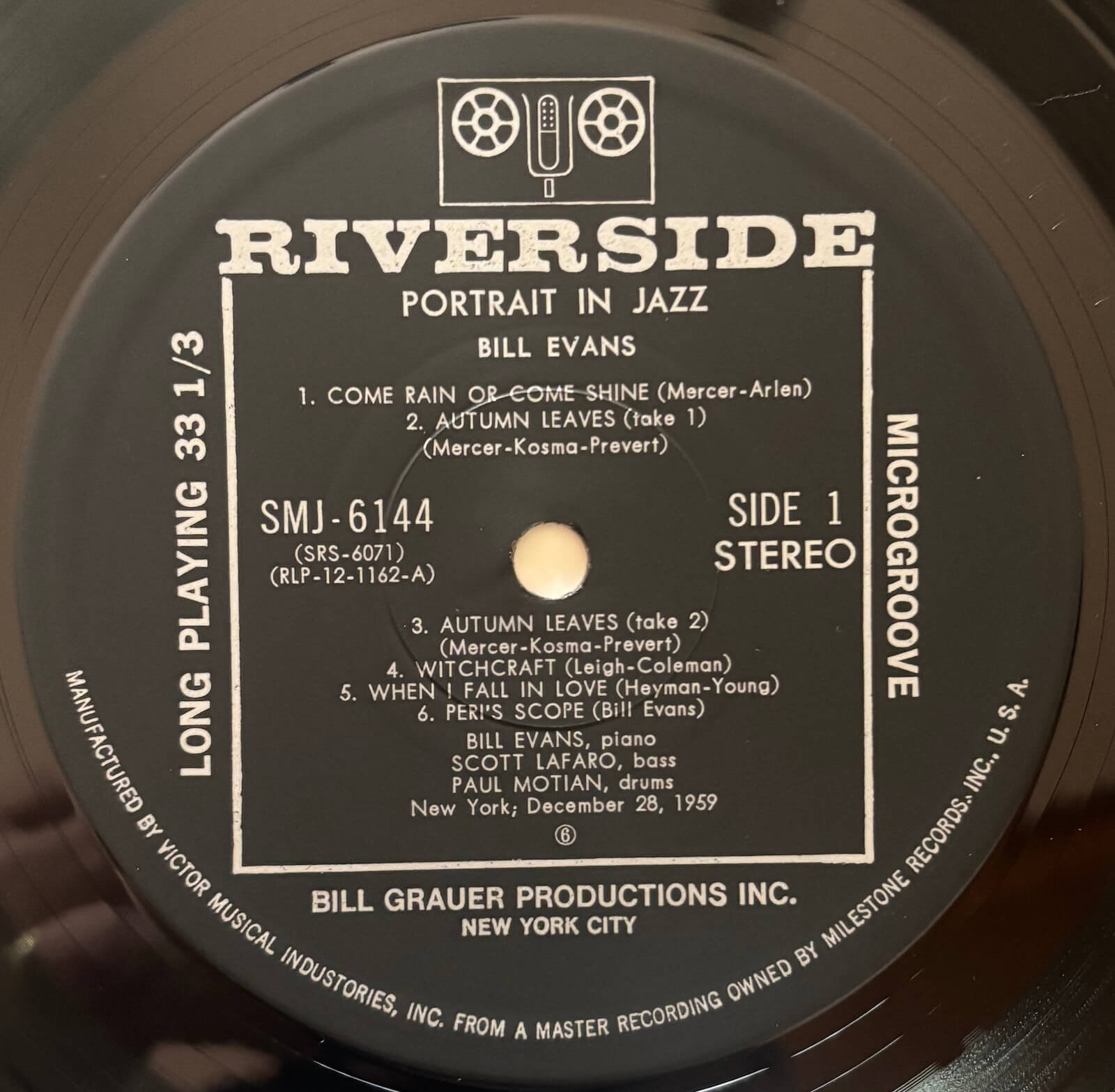The nine performances include seven jazz standards and two originals. "Peri's Scope" is an Evans composition; "Blue in Green" is credited to Evans and Davis, co-written for Kind of Blue the previous spring. "Someday My Prince Will Come," the Frank Churchill and Larry Morey song from the 1937 Disney film Snow White, had just been used as a jazz vehicle by Dave Brubeck two years earlier, and Evans would return to it throughout his career. This pressing includes both the stereo and mono masters of "Autumn Leaves" — A2 and A3 — a feature of certain editions that preserves both approaches to the same track. What distinguishes the record from earlier piano trio recordings is the structural equality of the three instruments: LaFaro and Motian are not a rhythm section behind a soloist but active participants in the conversation. LaFaro died on 6 July 1961, in a car crash, aged 25, less than 18 months after this session. This 1976 Japanese pressing is manufactured by Victor Musical Industries, Inc. and is No. 64 in the Riverside Original Recording Series.