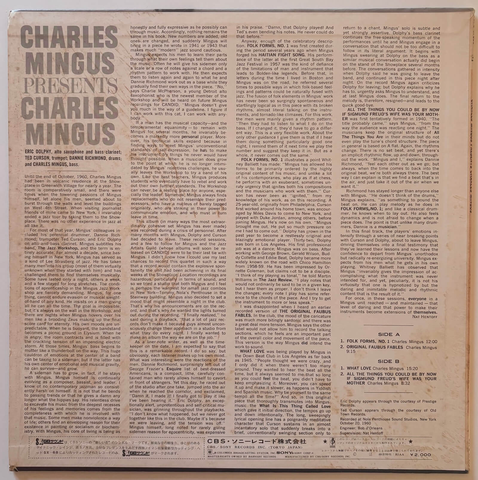 This Japanese stereo reissue includes the original insert and represents an important document from Mingus' golden period. Eric Dolphy's presence alone makes this essential, as his work here exemplifies the innovation and emotional depth that made him one of jazz's most important voices before his tragic early death in 1964.