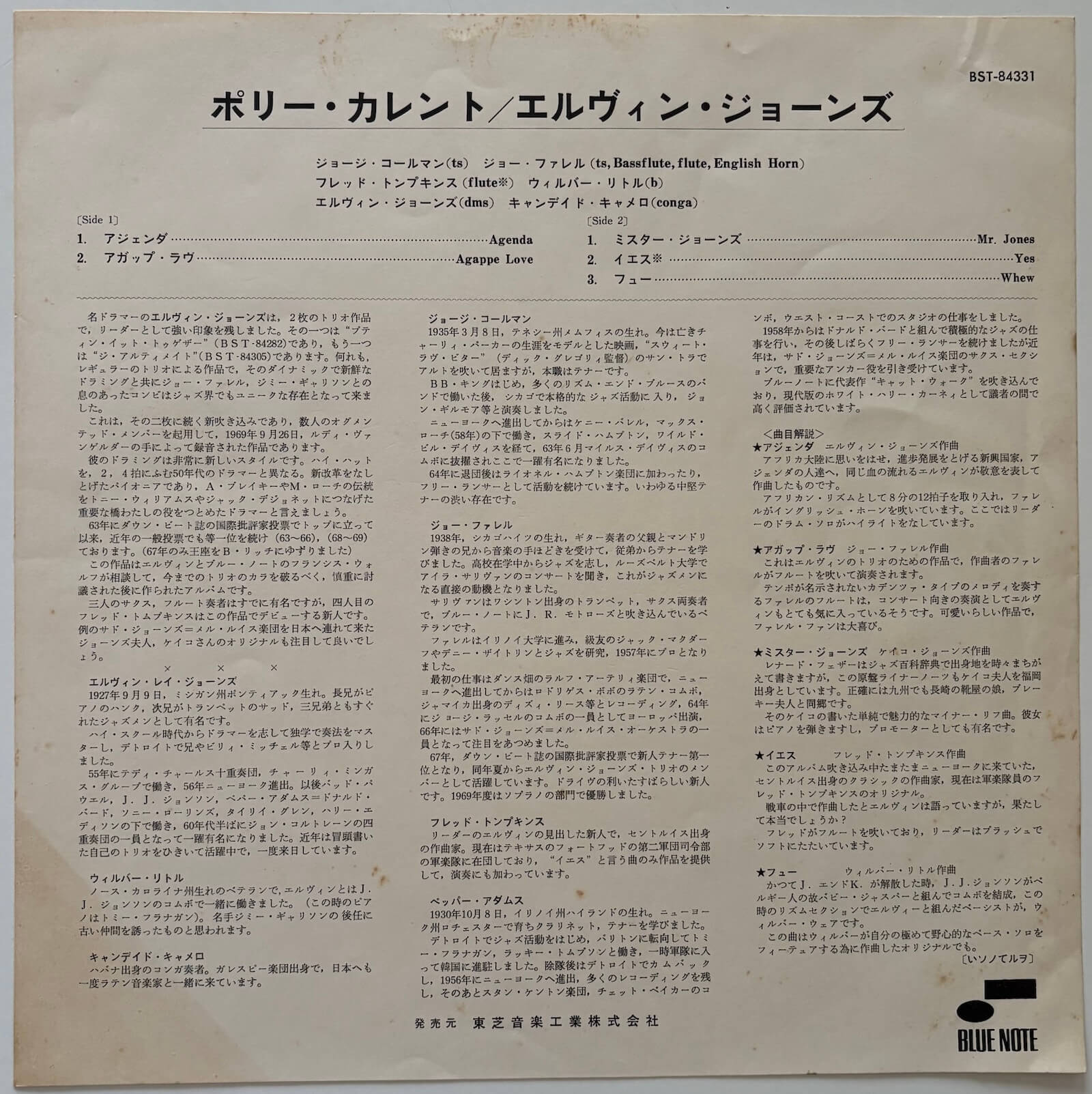 One of the most powerful and innovative drummers in jazz history steps into the leader's chair for Poly-Currents, a commanding post-bop session that showcases Elvin Jones' polyrhythmic mastery and his ability to inspire extraordinary playing from his band. Recorded on 26 September 1969 at Van Gelder Studio and released in 1970, this original US Blue Note pressing was distributed by Toshiba Musical Industries Ltd. for the Japanese market, complete with Japanese liner notes, making it a fascinating hybrid of American manufacturing and Japanese distribution.