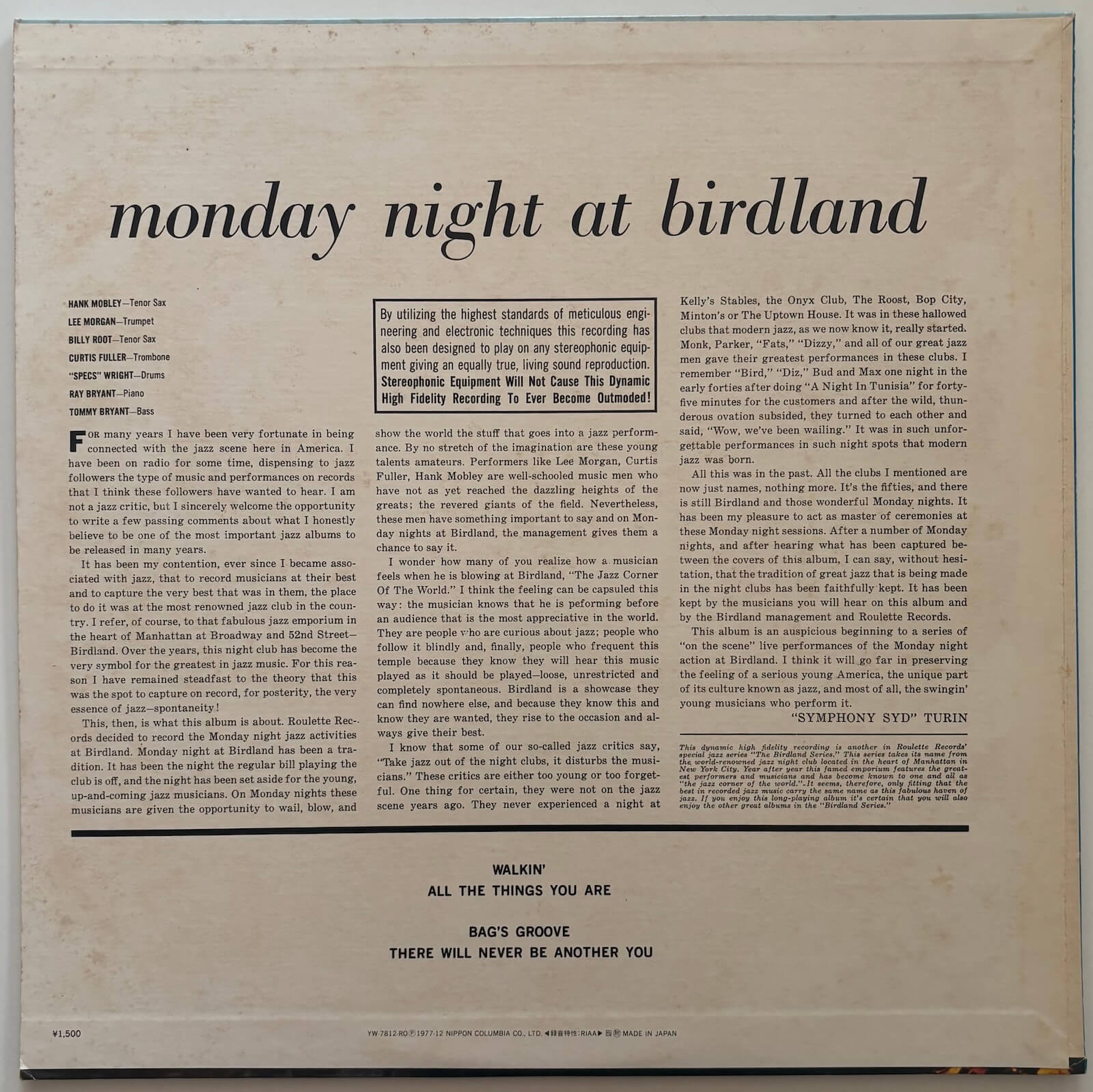 Mobley's tenor sits at the centre of the session, his characteristically warm, slightly smoky tone providing a point of contrast to Morgan's brightness and Fuller's French horn-like richness. Ray Bryant's piano comping, assured and rhythmically grounded, holds the rhythm section together beneath Specs Wright's drums across four performances that run as extended jam sessions rather than tightly arranged set pieces. Released in Japan in 1977 on Roulette (YW-7812-RO) as part of the Birdland Series and manufactured by Nippon Columbia Co., Ltd., this pressing presents a live document of hard bop at street level, not a Blue Note session under Van Gelder's microphones but musicians playing for a room, the energy of the performance intact.
