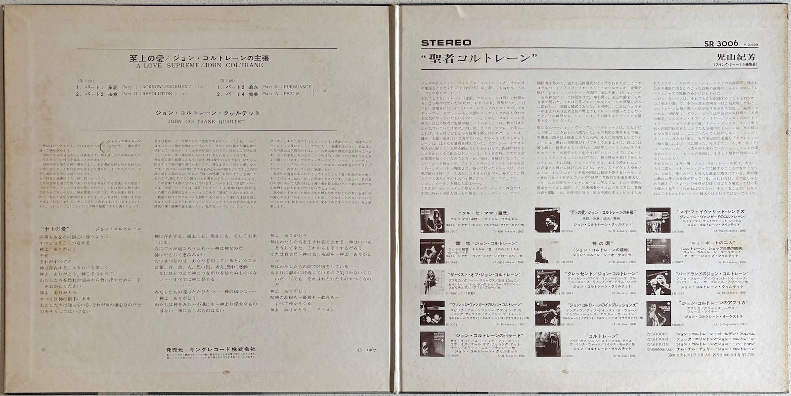 This Japanese pressing captures Bob Thiele's production and Rudy Van Gelder's engineering with excellent fidelity. The gatefold format preserves Coltrane's original liner notes and poem, making this not just a listening experience but a complete artistic statement. For jazz collectors, this 1967 King Record pressing represents both historical significance and sonic excellence.