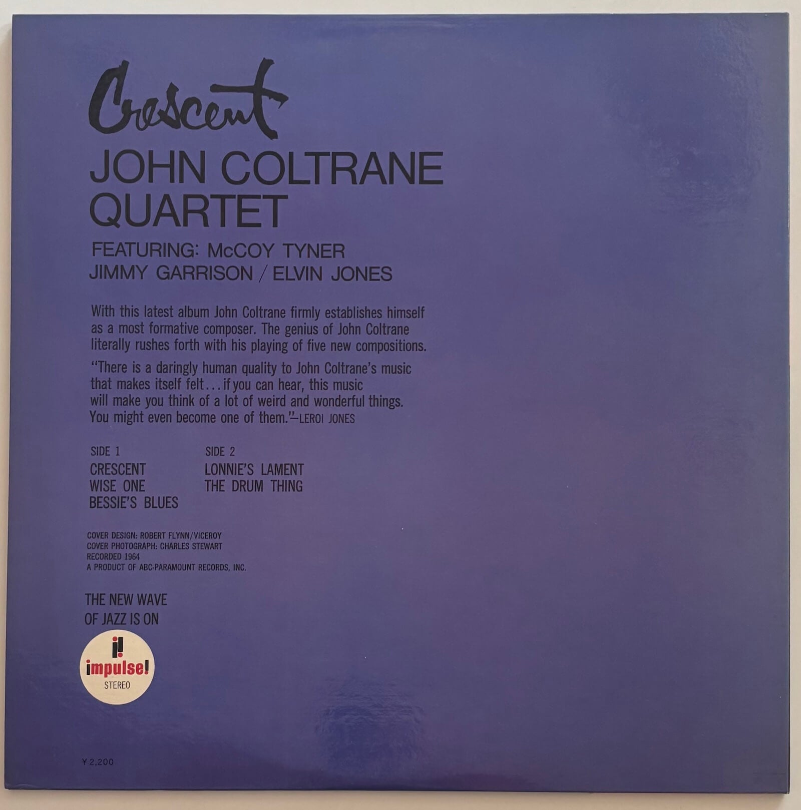 Crescent was recorded at Van Gelder Studio in Englewood Cliffs across two sessions in 1964, the quartet entering on April 27 and recording what became "Wise One", "Lonnie's Lament" and "The Drum Thing", returning on June 1 to record the title track and "Bessie's Blues". Released on Impulse! in July 1964 as AS-66, the album sits squarely between Coltrane's extended modal period and the full flowering of the spiritual direction that A Love Supreme, recorded six months later in December, would announce to the world. The five compositions are all Coltrane originals, and the album has a quality of unhurried assurance, the classic quartet of McCoy Tyner on piano, Jimmy Garrison on bass and Elvin Jones on drums operating as a single organic unit beneath Coltrane's tenor. Side A gives Coltrane the foreground across three pieces: the contemplative title track, the modal richness of "Wise One" where Tyner's piano is particularly prominent, and "Bessie's Blues", a blues vehicle that provides some release from the album's prevailing introspection. Side B belongs to the rhythm section. "Lonnie's Lament", which runs to nearly twelve minutes, features no Coltrane solo at all; it is Garrison's bass that carries the long central statement. "The Drum Thing" is an improvisational feature for Jones, with only spare melodic accompaniment from Coltrane and Garrison at its opening and close. The decision to give over an entire LP side in this way, to step back and let the musicians who supported him take the weight, says something significant about how Coltrane understood ensemble music by 1964. Liner notes are by Nat Hentoff and photography by Charles Stewart, whose inner gatefold portrait of Coltrane was also used on the cover of A Love Supreme.