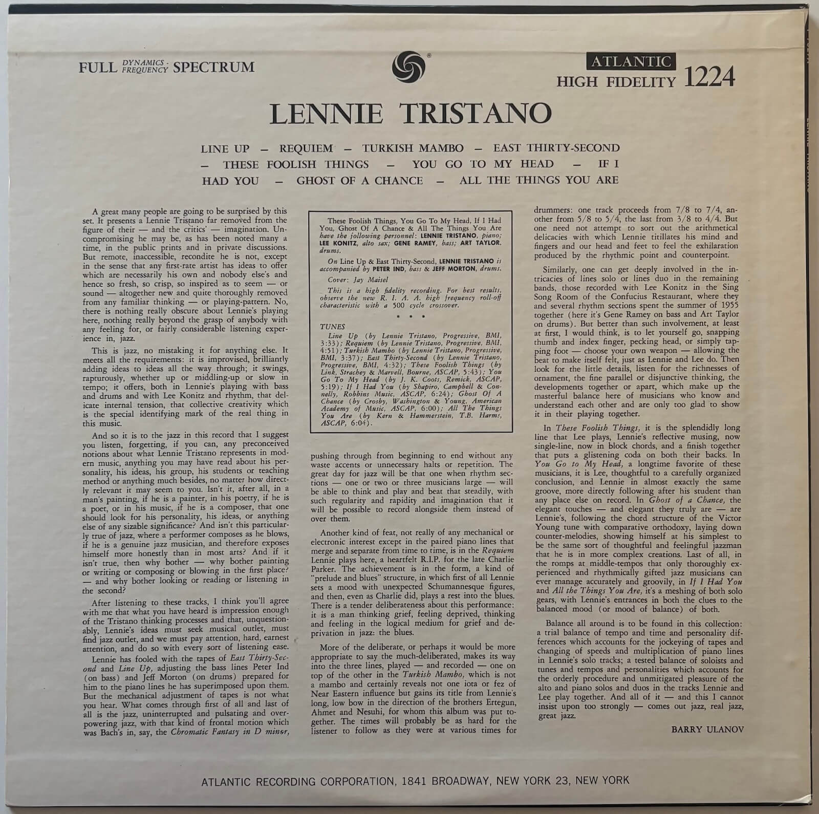 The second half of the album presents live recordings from the Sing Sing Room at the Confucius Restaurant in New York City during summer 1955, featuring Lee Konitz on alto saxophone, Gene Ramey on bass, and Art Taylor on drums. These four standards - "These Foolish Things", "You Go To My Head", "If I Had You", "Ghost Of A Chance", and "All The Things You Are" - reveal the telepathic musical relationship between Tristano and Konitz. Both musicians shared an aesthetic of cool detachment, sophisticated harmonic thinking, and melodic lines that seemed to float above the rhythm section's pulse.