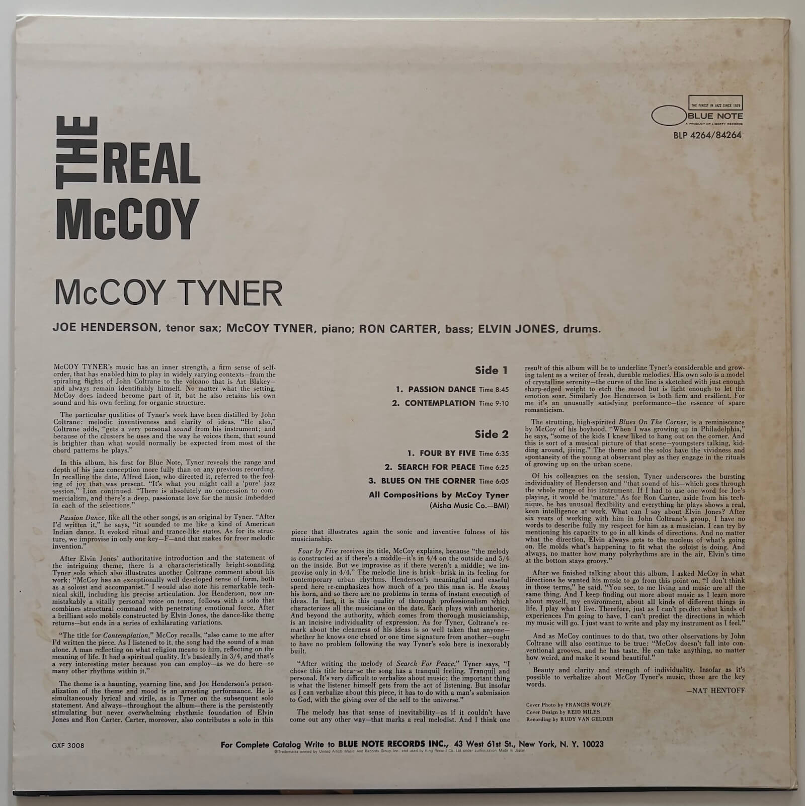 McCoy Tyner recorded The Real McCoy on 21 April 1967 at Rudy Van Gelder's studio in Englewood Cliffs, New Jersey — his second Blue Note album and the record on which his post-Coltrane voice came into its own. He had spent five years in John Coltrane's quartet, a period that shaped his approach to harmony, modal texture and rhythmic density, but by 1967 he was working through those ideas on his own terms. Alfred Lion produced. All five compositions are Tyner originals, and the personnel — Joe Henderson on tenor, Ron Carter on bass, Elvin Jones on drums — is as strong a quartet as Blue Note assembled that year. Henderson's presence as a co-equal voice, rather than a backing instrument, gives the music an argumentative quality: the interplay between piano and tenor on "Passion Dance" and the closer "Blues on the Corner" has rarely been bettered in a piano-led small group setting.