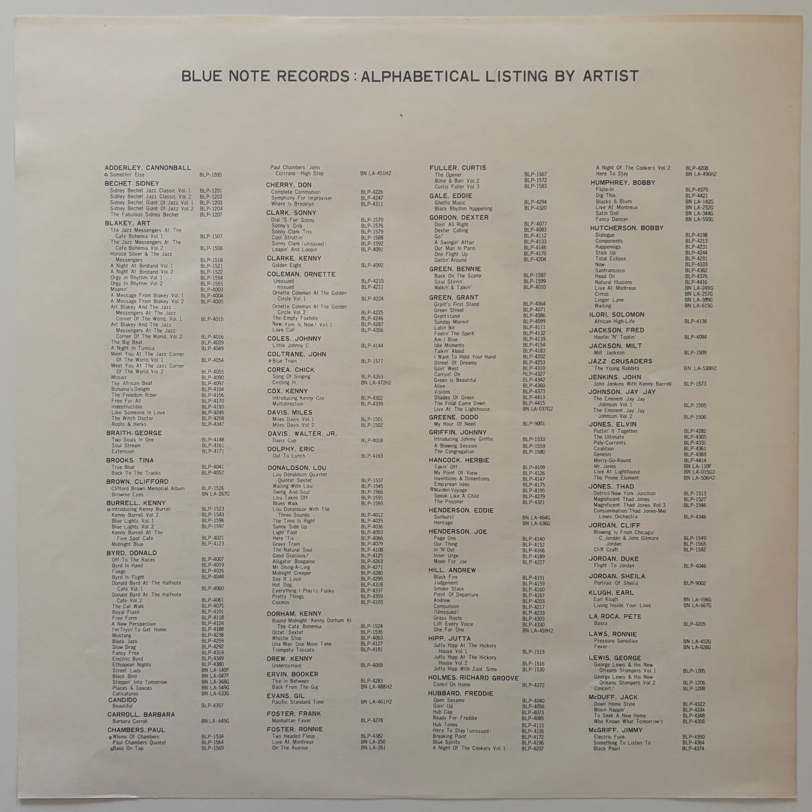 This 1977 Japanese pressing is from the "Blue Note Immortal Masterpiece Selection", a limited edition series of 20 titles issued by King Record Co. Ltd. to mark their acquisition of the Blue Note Japan distribution contract. It preceded the 1978 Blue Note Masterpiece Selection 150 series. The pressing comes with two LP-sized inserts: an alphabetical Blue Note artist listing printed on both sides, and a Japanese-language track information sheet.