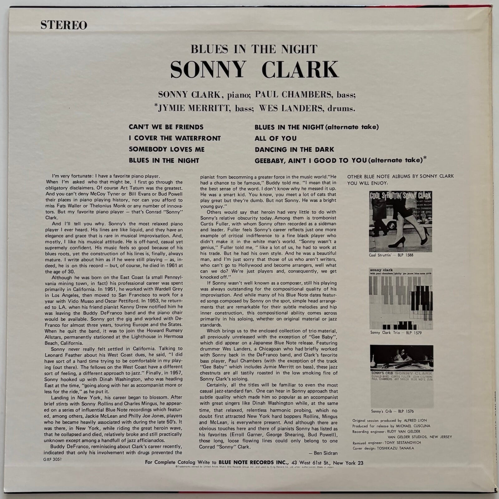 A showcase for one of hard bop's most distinctive pianists, Blues In The Night captures Sonny Clark leading a tight trio through a session that highlights his elegant touch, blues-soaked sensibility and impeccable sense of swing. This 1979 Japanese limited edition pressing, manufactured by King Record Co. and released on Blue Note's GXF series, presents Clark's artistry with the sonic excellence Japanese audiophile editions are prized for.