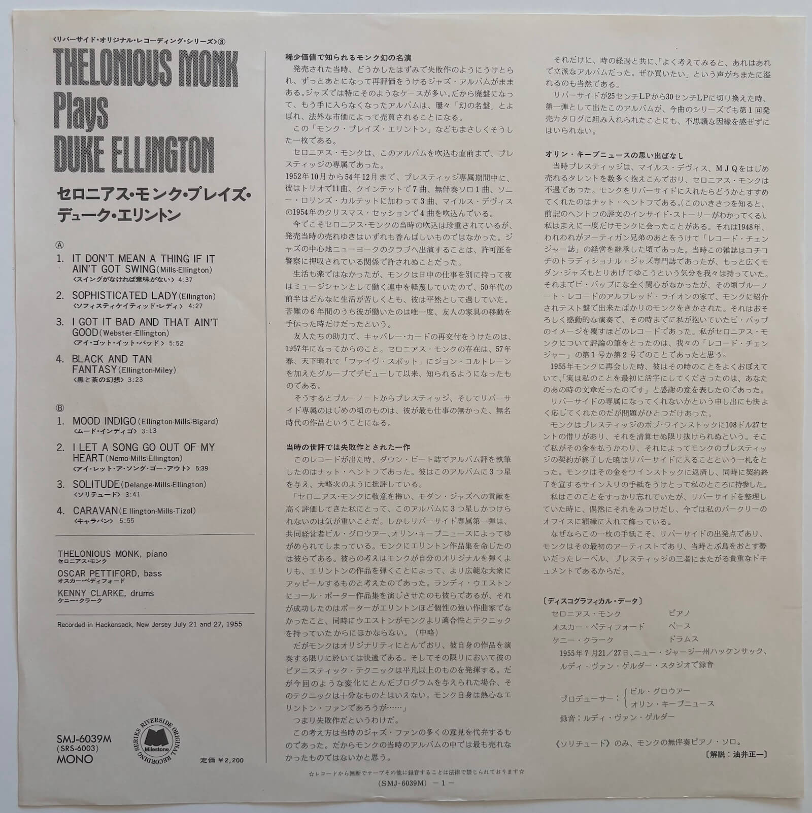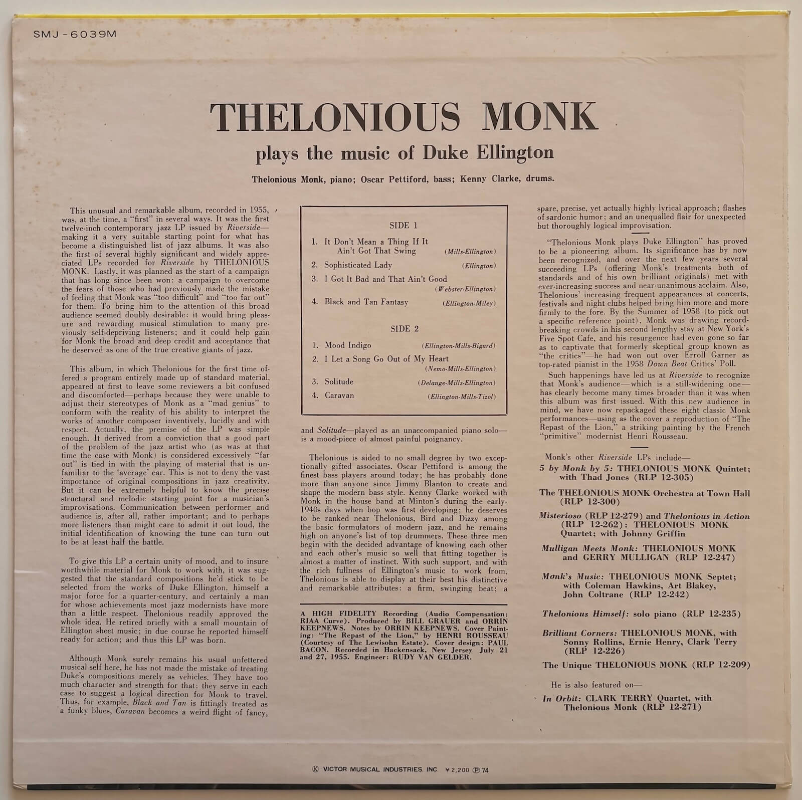 The album opens with "It Don't Mean a Thing (If It Ain't Got That Swing)" and works through eight Ellington compositions, all of them well known enough to serve Keepnews' strategy but none of them diminished by Monk's treatment. His angularity, his use of silence and unexpected accent, the rhythmic commentary built into his left hand, are present throughout, and the trio plays with the kind of self-contained confidence that comes from musicians who know each other's language. "Black and Tan Fantasy", co-written by Ellington and Bubber Miley, is treated as a funky blues. "Caravan", co-written with Juan Tizol, becomes a showcase for the rhythm section. "Solitude" is played entirely alone: Monk dismisses Pettiford and Clarke and plays it unaccompanied, the only such moment on the record, moving slowly into rubato at the end. The album was first issued in December 1955 as "Thelonious Monk Plays the Music of Duke Ellington" (Riverside RLP 12-201); the 1958 reissue shortened the title and replaced the original cover photography with Henri Rousseau's "The Repast of the Lion", the version most commonly reproduced. This mono pressing is part of Victor Musical Industries' Riverside Original Recording Series, released in Japan in 1974 as Milestone SMJ-6039M.