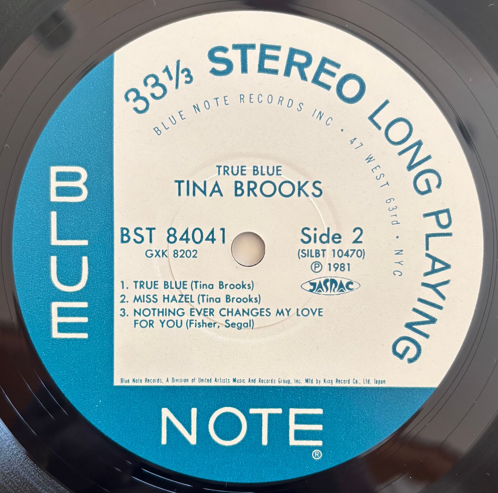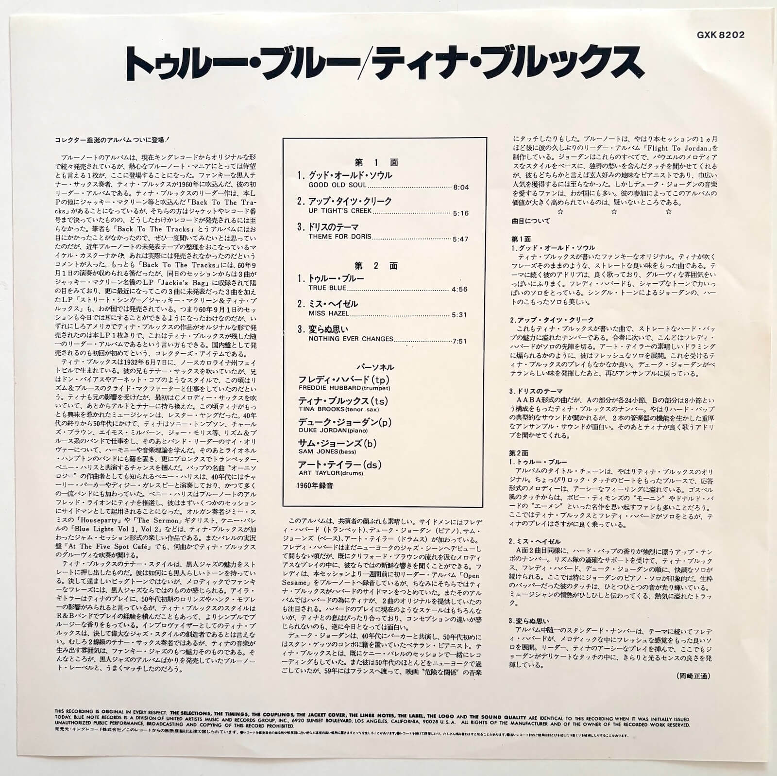 Tenor saxophonist Tina Brooks' masterpiece, recorded on 25 June 1960 at Rudy Van Gelder's Englewood Cliffs studio. Featuring 22-year-old trumpeter Freddie Hubbard (months before his own Blue Note debut), pianist Duke Jordan, bassist Sam Jones, and drummer Art Taylor, the sextet performs six Brooks compositions demonstrating his gift for memorable melodies and sophisticated harmonic movement. Brooks' tenor saxophone sound, influenced by Sonny Rollins yet distinctly his own, combines technical command with deeply personal expression, his playing on tracks like the title composition "True Blue" and "Miss Hazel" revealing why fellow musicians revered him despite his lack of commercial recognition. Released in Japan in 1981 by King Record Co. Ltd. as part of Blue Note's Collectors' Item Series, this represents the album's first stereo pressing—Blue Note's original issue was monaural only—and its first Japanese pressing.